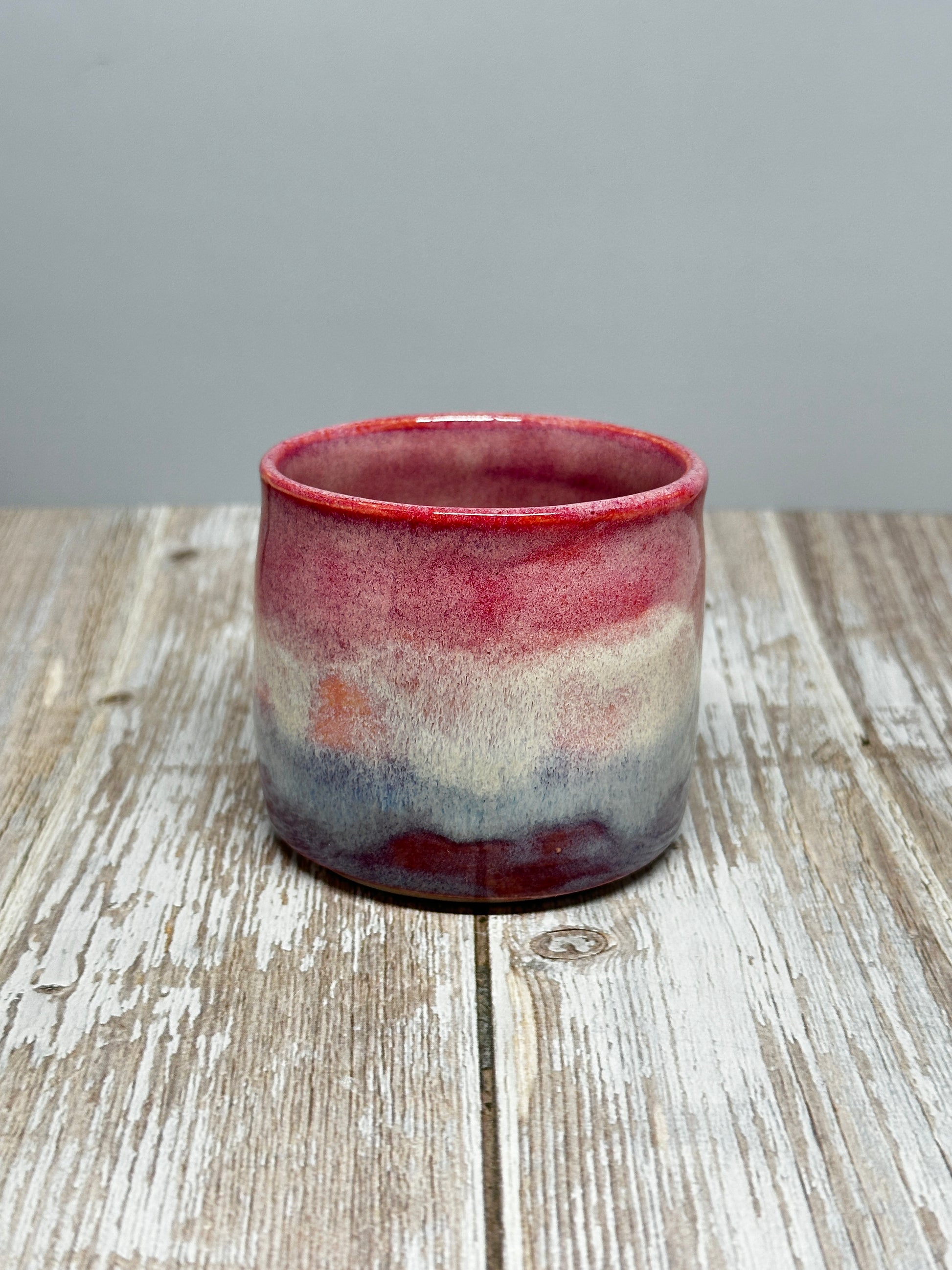 A handmade ceramic cup bears the subtle variations of form and decoration that make it uniquely charming. Its thick walls retain heat beautifully, making it ideal for nursing a morning coffee or cradling an evening cup of tea. Beyond beverages, it works equally well as a desk organizer for pens and paintbrushes, a small planter for succulents, or even a rustic vessel for serving soup or dessert when you want to add artisanal warmth to your table. Holds approximately 5 ounces.